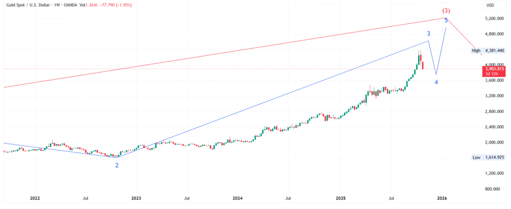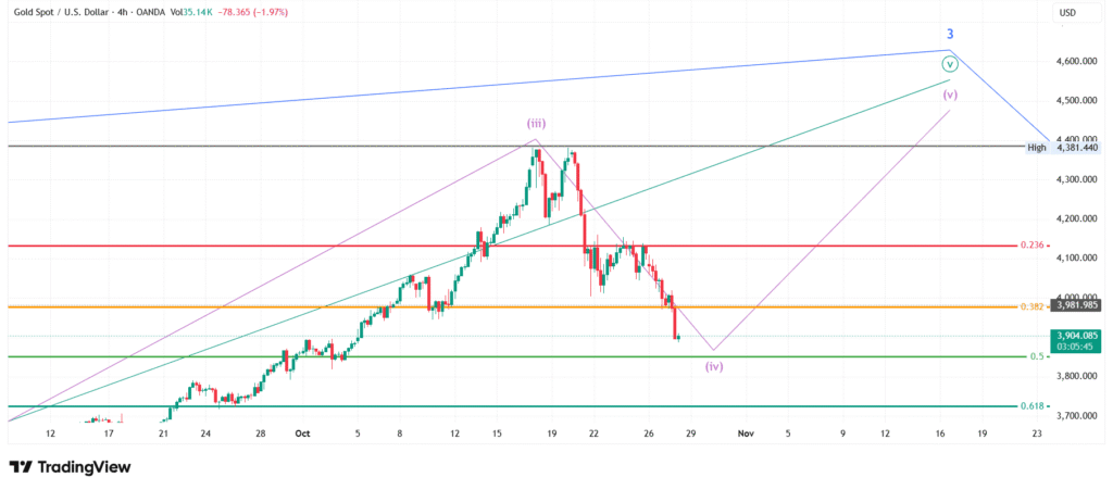 On A 4-Hours Chart : Wave (V) of Degree 3 is still developing on XAU/USD : Gold 4-Hours Chart. The smaller wave (iv) of degree 2 seems to developing as the wave ( iii) is completed in mid Oct 2025.
